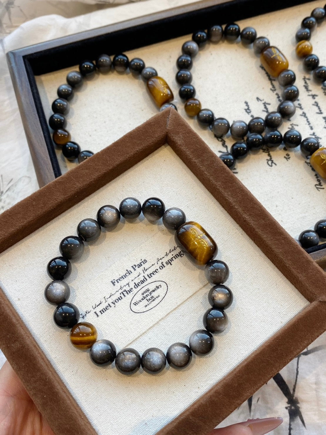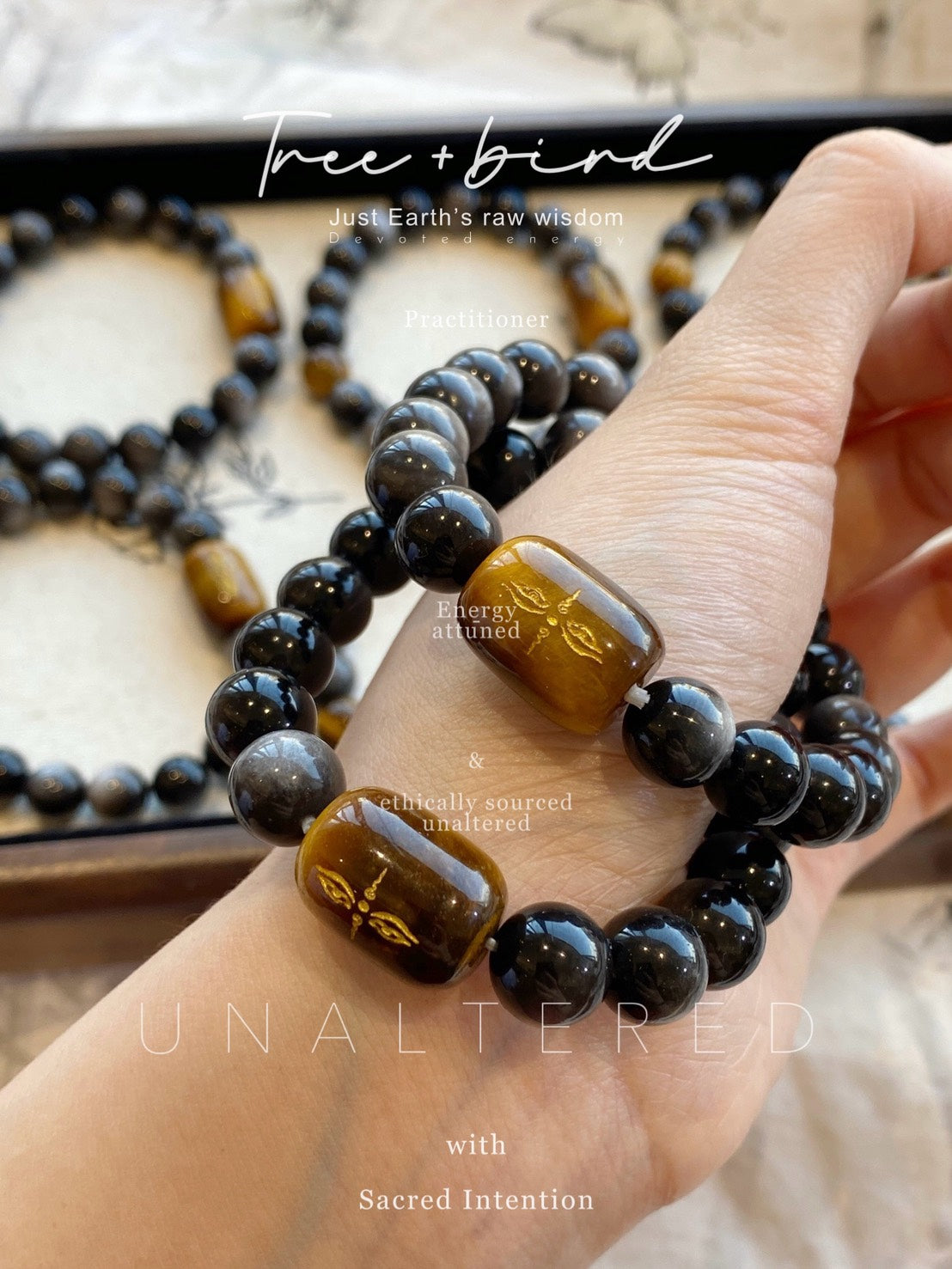天然黃虎眼 × 雕刻銀曜石水晶手串|10mm|情侶款